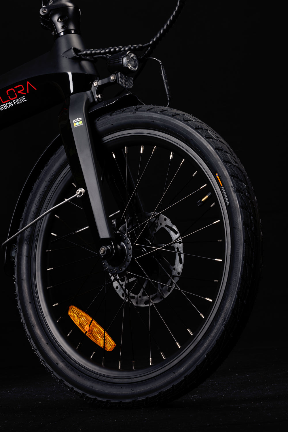 The Explora Carbon Fibre Folding E-Bike comes equipped with fully integrated front and rear LED lights, ensuring you’re visible and safe in all conditions. The rear light features an intelligent brake light function that automatically illuminates brighter when you slow down, alerting others to your movements. Designed for seamless integration into the bike’s frame, these lights offer a sleek appearance while enhancing safety during night rides or low-visibility conditions. With the Explora, you can ride confidently, day or night, knowing your safety is a top priority.