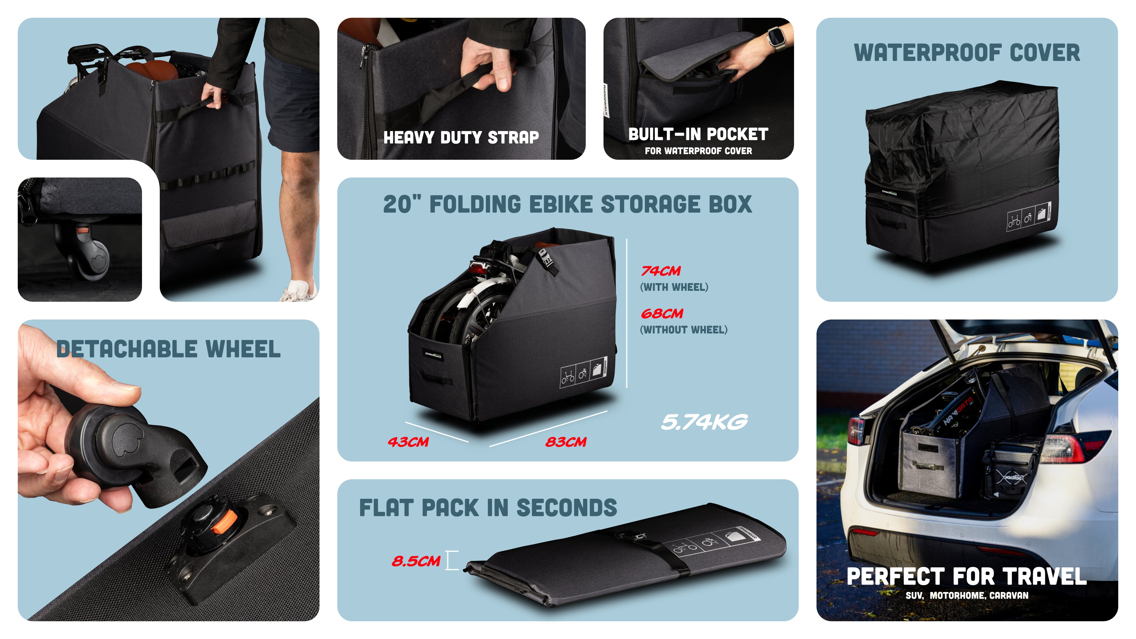 Meet the Pedibal Portable Storage System, a rugged yet elegant storage solution. Designed specifically for the Navigata Folding eBike, Explora Folding eBike, and most 20‑inch folding e‑bikes, this case transforms your bike into a neat, upright block for travel or home storage. Crafted from splash‑proof cationic polyester with a reinforced base, the Pedibal Portable Storage System protects your bike from rain and road spray. Four removable wheels and front/back handles make it easy to manoeuvre, while the integrated rain/dust cover and MOLLE strap system add extra versatility.